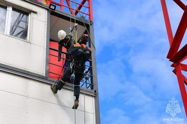 Третьим этапом стало оказание помощи пострадавшим с помощью альпинистского снаряжения с высоты. По легенде, в беде оказались монтажник и альпинист.