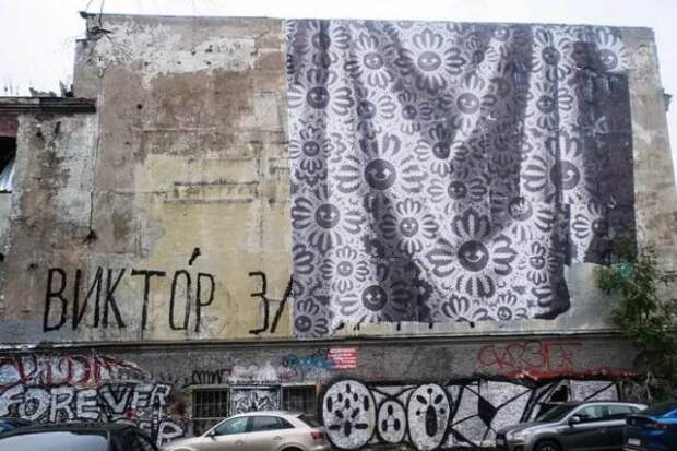 В сентябре другой петербургский художник — Максим Гамма, который чаще всего работает с постерами с изображением улыбающегося цветка, — перекрыл тег Виктора Забуги другим стрит-артом. Он нарисовал простынь, покрытую цветами, свисающую с крыши дома культуры.