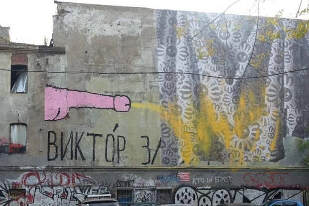 Виктору Забуге это не понравилось, и спустя несколько дней он нарисовал ответную работу на стене того же дома культуры: пенис, который мочится на работу Максима Гаммы.