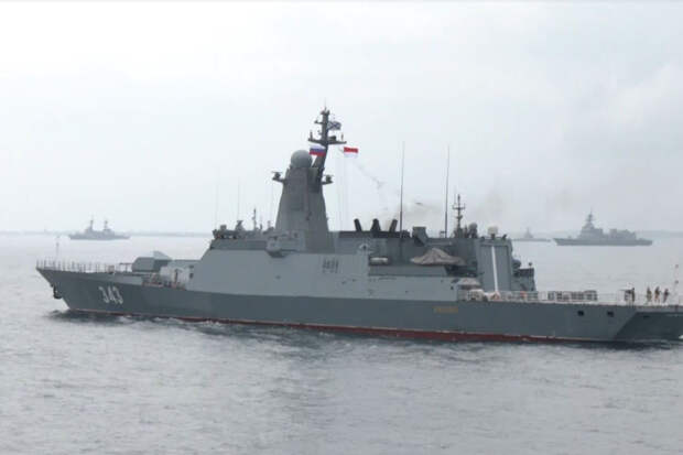 По прибытию в назначенный район якорной стоянки российские моряки подняли Государственные флаги Российской Федерации и Республики Индонезия.