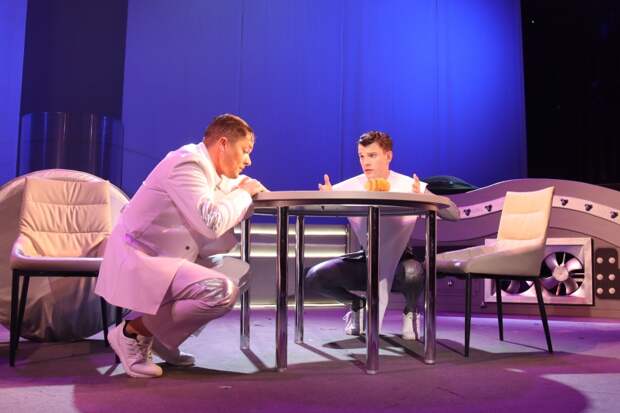 Пьеса Михаила Хейфец имеет сюжетный подзаголовок — "футуристическая комедия в жанре социальной утопии". Режиссер-постановщик Александр Нешинкин подошел к этому скрупулезно, превратив фабулу повествования в причудливую фантасмагорию. Лиловые волосы главной героини и серебристые одежды а-ля "робот Вертер" из классики советского кинопрома "Гостья из будущего" — в виде футуристичной детализации.