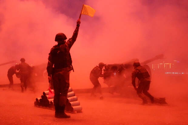 Военнослужащие выполнили 30 залпов из 122-мм гаубиц Д-30 и выпустили в небо более 500 фейерверков «Вега» и «Ассоль» из салютных установок 2А85 на базе автомобиля «КаМАЗ».