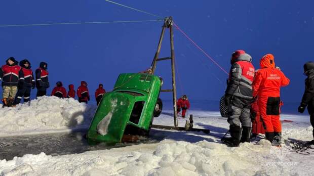 С помощью вездехода «Бурлак» специалисты подняли автомобиль из майны. Спасатели использовали конструкцию «Дельта», что позволило эффективно извлечь машину из ледяной воды.