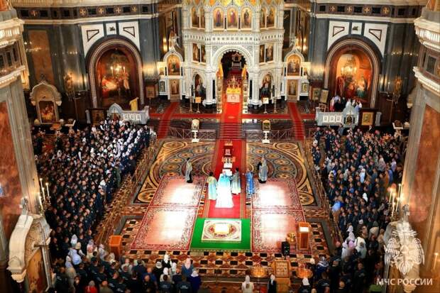 Представители центрального аппарата ведомства посетили богослужение в Кафедральном Соборном Храме Христа Спасителя в Москве. Всего в молебне приняли участие 1 200 сотрудников МЧС России.