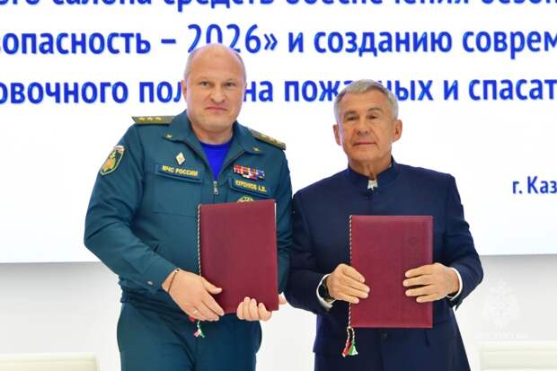 16 июля в Казани главы МЧС России Александр Куренков и Республики Татарстан Рустам Минниханов подписали соглашение по подготовке и проведению в следующем году XVI Международного салона средств обеспечения безопасности «Комплексная безопасность - 2026» и созданию современного учебно-тренировочного полигона пожарных и спасателей.